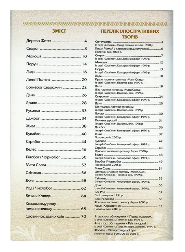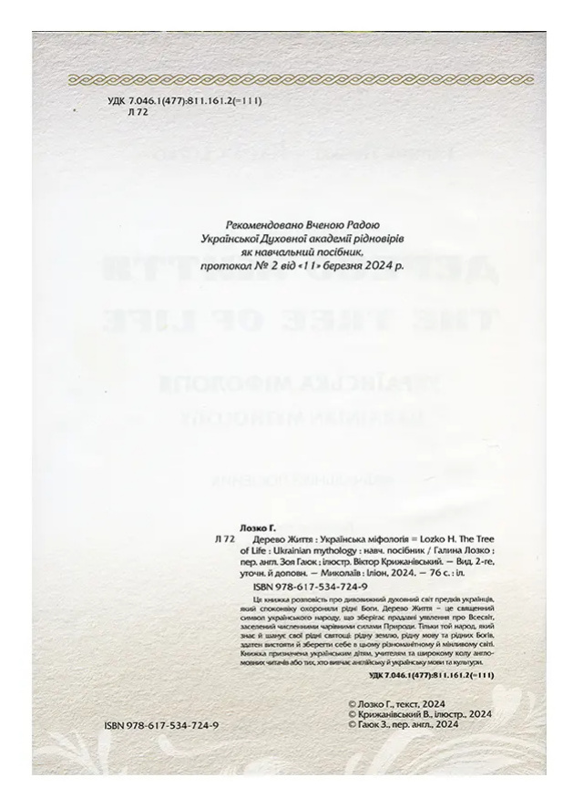 Опис: “Дерево життя” – це про дивовижний духовний світ предків українців, споконвіку охороняли рідні Боги. “Дерево Життя” – це священний символ українського народу, що зберігає прадавні уявлення про Всесвіт, заселений численними силами Природи. Тільки той народ, який знає й шанує свої рідні святощі: свою рідну землю, рідні мову та рідних Богів, здатен вистояти й зберегти себе в цьому різноманітному і мінливому світі. Книга призначена українським учителям та широкому колу англомовних або тих, хто вивчає англійську та українську мови та культуру.